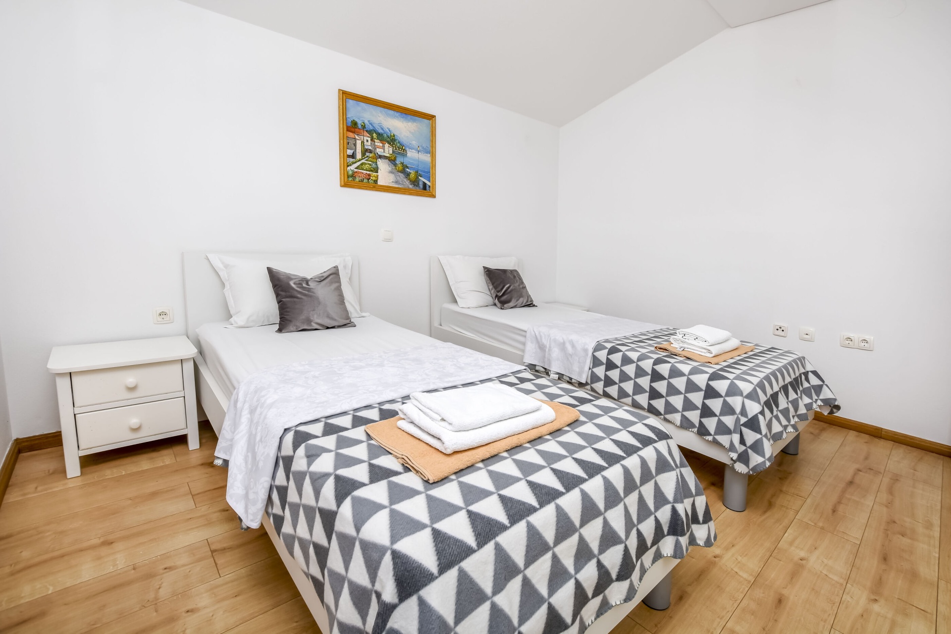 Apartman 4Fő Általános információ Kategória: 3 Emelet: második emelet Típus: A4 Felület: 56 m2 Kilátás: tengerre Berendezés és felszereltség Fűtés: helyiség része Klíma: helyiség része Internet: vezeték nélküli Ágynemű és törölközők: Igen Önkiszolgáló bejelentkezés: Host check-in Az adott többletszolgáltatás felára a helyszínen fizetendő Klíma: felár nélkül Fűtés: felár nélkül Internet: felár nélkül Konyha és nappali Edények és evőeszközök: Igen Sütő: Igen Főzőlap: Igen Hűtőgép: Igen Fagyasztó: Igen Mikrohullámú sütő: Igen Kávéfőző: Igen A kert felszerletsége Kültéri zuhanyzó: Igen Terasz: 8 m2 Fürdőszoba információ Zuhanyzós fürdőszobák száma: 1 Adatok a szobákról 1 Szoba kapacitás: 2 Kétszemélyes ágyak száma: 1 A szoba alapterülete: 16 m2 Adatok a szobákról 2 Szoba kapacitás: 2 Egyágyas ágyak száma: 2 A szoba alapterülete: 14 m2