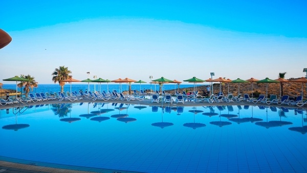 A szállodától kb. 200 m-re található egy homokos öböl, amely homokos és zsindelyes stranddal rendelkezik, enyhén lankás lejtéssel. A napernyők és napozóágyak térítés ellenében használhatók. Ezen kívül, kb. 900 m-re a híres Nissi strand található, amely szintén homokos és enyhén lankás. A strand megközelíthető helyi úton, és itt is térítés ellenében vehetők igénybe a napernyők és nyugágyak (kb. 7,5 EUR/készlet).