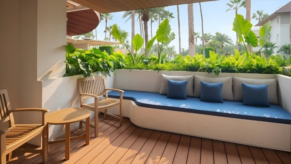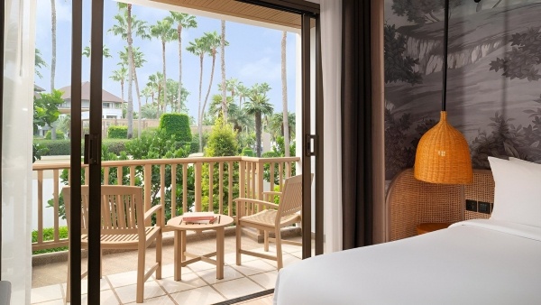 Deluxe kertre néző kétágyas szoba: kb. 43 m?, klimatizált, félnyitott fürdőszoba (zuhanyzó, WC, hajszárító, kozmetikai csomag, köntös és papucs), vezeték nélküli internet, smart TV, telefon, széf, kávé-/teafőző készlet, kis hűtőszekrény, erkély (asztal és székek), kertre néző kilátás.