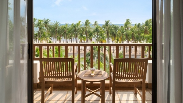 Deluxe tengerre néző kétágyas szoba: kb. 43 m?, klimatizált, félnyitott fürdőszoba (zuhanyzó, WC, hajszárító, kozmetikai csomag, köntös és papucs), vezeték nélküli internet, smart TV, telefon, széf, kávé-/teafőző készlet, kis hűtőszekrény, erkély (asztal és székek), tengerre néző kilátás.