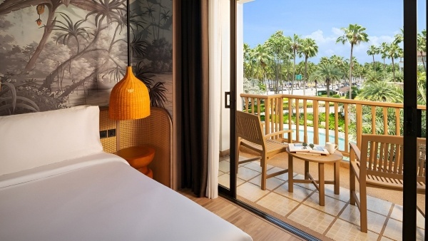 Deluxe medencére néző kétágyas szoba: kb. 43 m?, klimatizált, félnyitott fürdőszoba (zuhanyzó, WC, hajszárító, kozmetikai csomag, köntös és papucs), vezeték nélküli internet, smart TV, telefon, széf, kávé-/teafőző készlet, kis hűtőszekrény, erkély (asztal és székek), medencére néző kilátás.