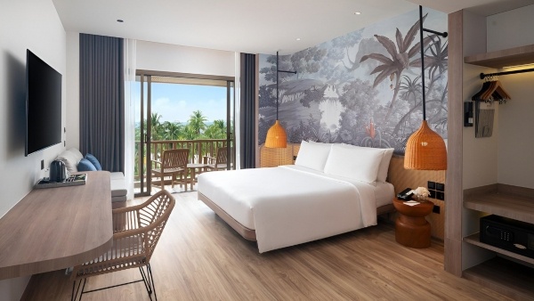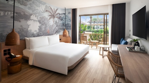 Deluxe kertre néző kétágyas szoba: kb. 43 m?, klimatizált, félnyitott fürdőszoba (zuhanyzó, WC, hajszárító, kozmetikai csomag, köntös és papucs), vezeték nélküli internet, smart TV, telefon, széf, kávé-/teafőző készlet, kis hűtőszekrény, erkély (asztal és székek), kertre néző kilátás.
