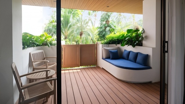 Deluxe kertre néző kétágyas szoba: kb. 43 m?, klimatizált, félnyitott fürdőszoba (zuhanyzó, WC, hajszárító, kozmetikai csomag, köntös és papucs), vezeték nélküli internet, smart TV, telefon, széf, kávé-/teafőző készlet, kis hűtőszekrény, erkély (asztal és székek), kertre néző kilátás.