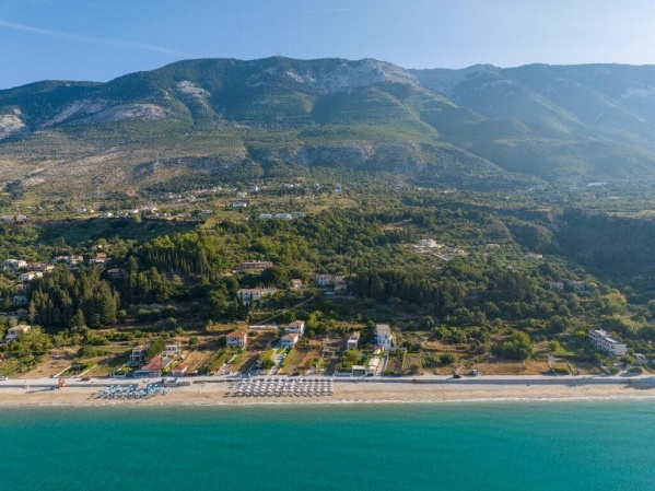 A közkedvelt apartmanház közvetlenül a fehér, finomhomokos/kavicsos tengerparton fekszik, a ház előtti terület kavicsos, a vízben már homokos. A kétszintes épület alsó szintje a ház tulajdonosának magánterülete. A házhoz tartozó kertben található a tulajdonos tavernája, ami híres a magas színvonalú, jó alapanyagokból készült ételeiről, itt reggeli, ebéd, vacsora a helyszínen kérhető. A parti sétányon tavernák, kávézók, mini szupermarket gyalogosan elérhető