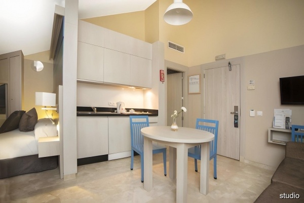 Stúdió: Körülbelül 30 m?-es, légkondicionált. A fürdőszobában kád vagy zuhanyzó, WC és hajszárító található. A hálószoba vizuálisan elválasztott, a konyhasarok pedig kis hűtőszekrénnyel, mikrohullámú sütővel, főzőlappal, mosogatóval és konyhai eszközökkel felszerelt. A szobában vezeték nélküli internet és műholdas TV is rendelkezésre áll. Az erkély vagy terasz asztallal és székekkel van berendezve, kilátással a környékre.