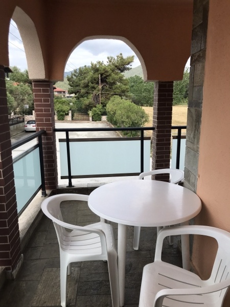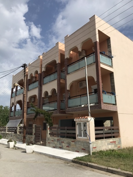 Az apartmanház Sarti új részén (Village) fekszik, kb. 70 méterre a homokos-aprókavicsos tengerparttól és kb. 500 méterre a központtól. A közelben éttermek, tavernák és pékség is található, ahol a híres ,,Liturgia" nevű kenyér is kapható.