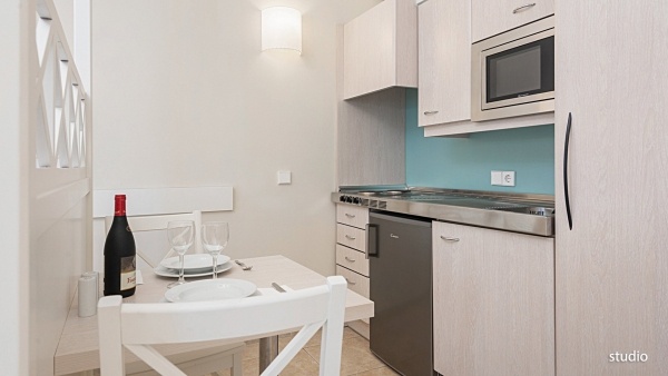 A stúdiók kb. 26 m?-esek, kétágyas elrendezésűek és klimatizáltak, fürdőszobájuk káddal vagy zuhanyzóval, WC-vel és hajszárítóval felszerelt. A vendégek rendelkezésére áll egy teljesen felszerelt konyhasarok, műholdas televízió és telefon, továbbá felár ellenében széf és vezeték nélküli internet is igénybe vehető. Előzetes kérésre 2 év alatti gyermek számára kiságy biztosítható térítés ellenében. Minden stúdióhoz erkély tartozik asztallal és székekkel, kilátással a környékre.