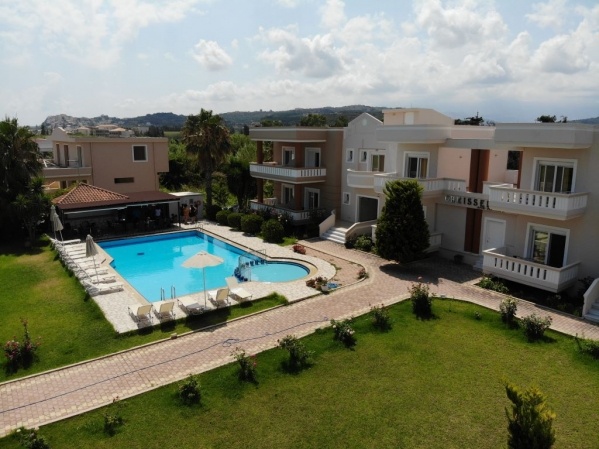 A mozgalmas Platanias településen, a homokos/aprókavicsos, köves tengerparttól mindössze kb. 400 m-re elhelyezkedő (autóúton is át kell kelni) családias, jó minőségű, 2 szintes (lift nincs, az emeleti szobák lépcsőn keresztül közelíthetők meg) apartmanház. Vásárlási lehetőség (LIDL szupermarket) kb. 150 méternyi sétányira, a település központja kb. 3 km-re található.