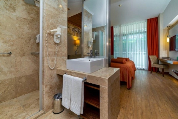 - A Deluxe lakosztályok 55 nm-esek, hálószobával és egy optikailag leválasztott nappalival rendelkeznek, a komplexum jobb és baloldali szárnyában találhatók, tengerre néznek. Kapszulás kávéfőzővel, hidromasszázs káddal és külön esőzuhannyal is felszereltek.