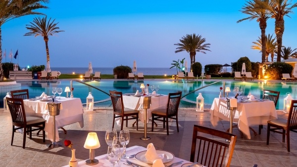 A szálloda gazdag és változatos gasztronómiai kínálattal várja vendégeit, ahol minden étkezés különleges élménnyé válik. Az Atrium étterem büfé és felszolgált ételekkel, ciprusi, olasz, mediterrán és távol-keleti ízekkel, valamint tematikus estekkel csábít. A Leda étterem svédasztalos és ? la carte formában kínál olasz specialitásokat, míg a Zephyr étterem - kizárólag 16 éven felüli vendégek számára - mediterrán reggelikkel és nemzetközi konyhával vár. A májustól októberig nyitva tartó Adonis étterem ? la carte mediterrán fogásokat kínál, a Palm Tree étteremben pedig szabadtéri, al fresco vacsorák élvezhetők ugyancsak mediterrán stílusban. Az éttermekben gyermekülések és vegetáriánus ételek is elérhetők, a vacsoránál az elegáns öltözet kötelező (urak számára hosszú nadrág), és minden ? la carte vacsorához előzetes foglalás szükséges.