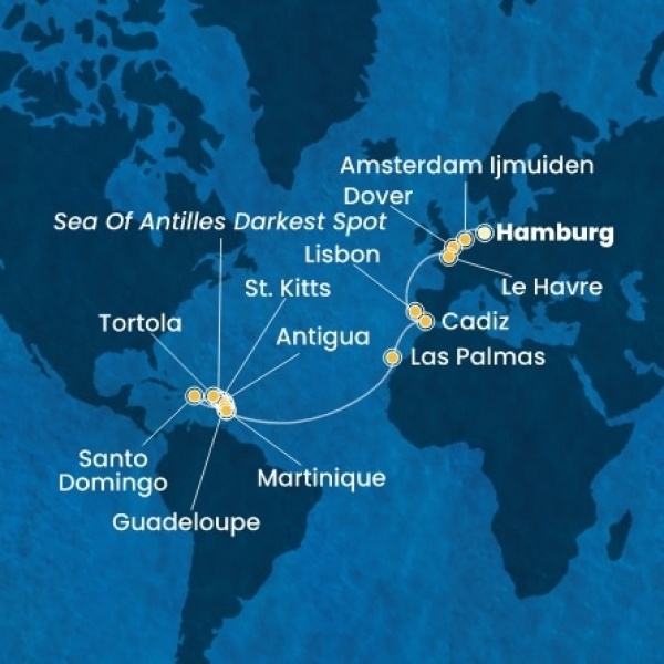 | 19. nap | Guadeloupe (Holland Antillák (ABC-szigetek)) | 08:00 | 23:00 |