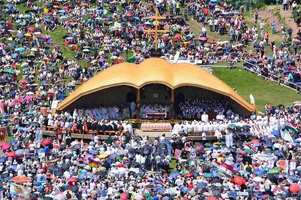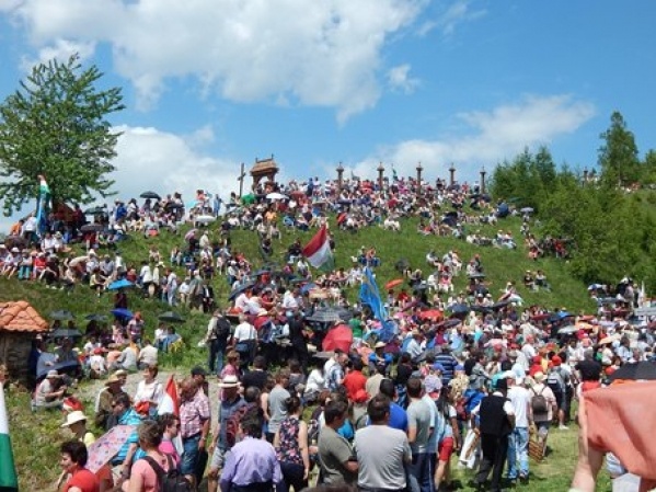 Reggeli után indulás a Csíksomlyói Búcsúba a szálláshelyek vasútállomásairól, az utaskísérők irányításával. Érkezés Csíkszereda vasútállomására, majd a keresztaljakkal gyalog megyünk Csíksomlyóra. Itt felkapaszkodunk a Kis- és Nagy-Somlyó közötti nyeregbe, ahol több százezer zarándok társaságában részt veszünk a 12.30-kor kezdődő szentmisén. Ezt követően érdemes egyénileg meglátogatni a Csodatévő Szűz Mária szobrot a Csíksomlyói kegytemplomban. A délutáni szabadidőben fakultatív séta Csíkszereda központjában, majd indulás vonattal vissza a szálláshelyekre. Estebéd a vendéglátóknál vagy falusi vendéglőben. Figyelem! Aki elszakadt a csoportjától, menjen a csíkszeredai vasútállomásra az idegenvezetője által megadott időpontra!