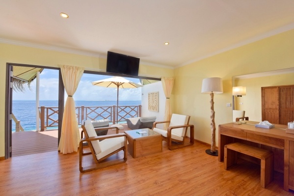 A tengerparti bungaló két fő részére alkalmas, egy pótágy lehetőségével. Az alapterülete körülbelül 78 m?, légkondicionált, és a fürdőszobában kád és zuhany, WC, hajszárító, valamint kozmetikai készlet található. Külső zuhany is rendelkezésre áll. A bungalóban vezeték nélküli internet, műholdas televízió, telefon, valamint kávé- és teafőző készlet is biztosított. A teraszon nyugágyak találhatók, és közvetlen lejárat van a strandra.