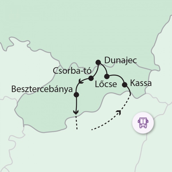 Ingyenes kora reggeli transzferek indulnak Szegedről, Debrecenből, és Pécsről Budapestre. Mindhárom útvonalon további felszállási lehetőségeket biztosítunk. A főváros után Miskolc, Tornyosnémeti útvonalon érünk Szlovákiába. A magyar történelemben is fontos szerepet játszó Kassa belvárosában nézelődünk. A főtér legmonumentálisabb épülete a Szent Erzsébet Székesegyház gótikus épülete, említésre méltó az Orbán-torony és a híres harang is. A tér ékessége a szecessziós Állami Színház épülete és az előtte lévő szökőkút. Következő megállónk Lőcse lesz. Ez a város több magyar elbeszélés színhelyéül szolgált. A központban lévő Szt. Jakab-templommal kezdjük a városnézést, ezt követi a Városháza, a Szégyenketrec és a Thurzó-ház megtekintése. Este érünk szállásunkra (3 éj), majd vacsorával zárjuk a napot.