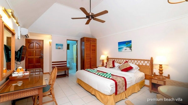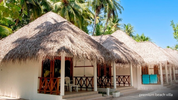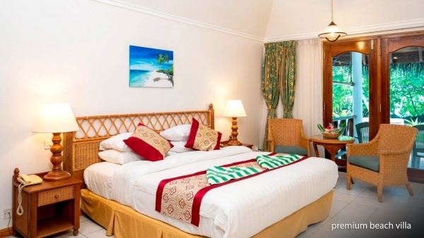 A prémium tengerparti villa szintén két fő számára készült, körülbelül 27 m?-es, és ugyanazokkal a felszerelésekkel rendelkezik, mint a deluxe tengerparti villa, kiegészítve egy további televízióval és terasszal, amely asztallal és székekkel van ellátva.