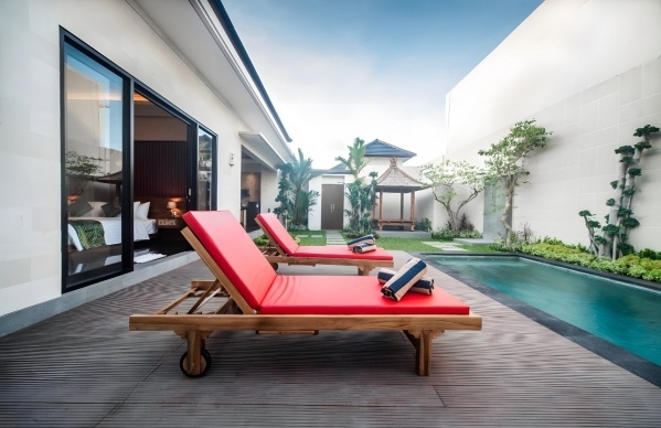 terasz saját kerttel és medencével (asztal, székek és balinéz ágy)
