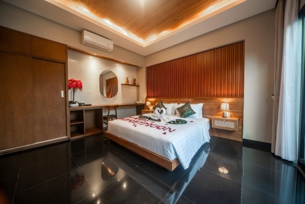 A medencés villa két fő számára, pótágy elhelyezésének lehetőségével körülbelül 125 m?-es, külön optikailag elválasztott hálószobával és nappalival rendelkezik. A légkondicionált villa fürdőszobája káddal és zuhannyal, WC-vel, hajszárítóval, köntössel és papuccsal felszerelt. A konyhasarok hűtőszekrénnyel, mikrohullámú sütővel és kávé-/tea készlettel rendelkezik. A tágas terasz saját kerttel és medencével vár, balinéz ággyal, asztallal és székekkel.