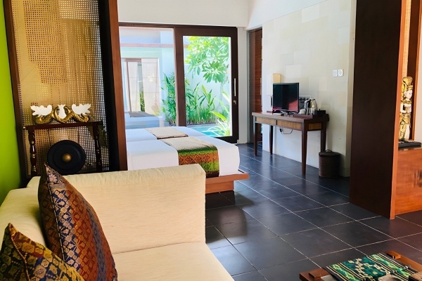 A medencés villa két fő számára, pótágy elhelyezésének lehetőségével körülbelül 125 m?-es, külön optikailag elválasztott hálószobával és nappalival rendelkezik. A légkondicionált villa fürdőszobája káddal és zuhannyal, WC-vel, hajszárítóval, köntössel és papuccsal felszerelt. A konyhasarok hűtőszekrénnyel, mikrohullámú sütővel és kávé-/tea készlettel rendelkezik. A tágas terasz saját kerttel és medencével vár, balinéz ággyal, asztallal és székekkel.