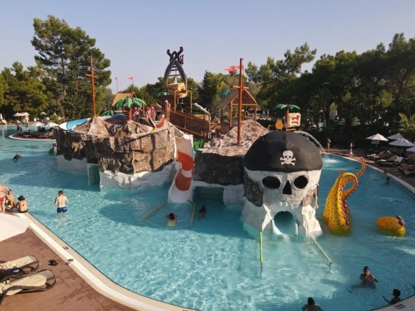 SZOLGÁLTATÁSOK: medencék napernyőkkel és napágyakkal o aquapark o főétterem o bárok (lobby, medence, strand stb.) o cukrászda o animációs programok o esti showműsor o élő zene o diszkó o amfiteátrum o fitneszterem o reggeli torna o strandröplabda o vízi torna o vízilabda o aerobik o minifoci o boccia o darts o asztalitenisz o wifi