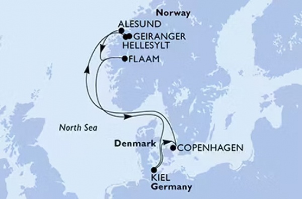 Kiel (Németország), Koppenhága (Dánia), Hellesylt (Norvégia), Geiranger (Norvégia), ?lesund (Norvégia), Fl?m (Norvégia), Kiel (Németország)