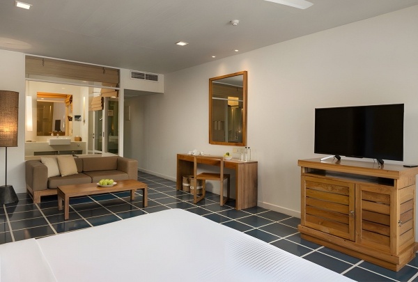 Deluxe 2 fős szoba 2 fő részére (1 pótágy lehetőséggel), kb. 59 m?, légkondicionált Fürdőszoba kád vagy zuhanyzóval, WC, hajszárító, köntös és papucs Vezeték nélküli internet, TV, telefon, széf, kávé/tea készlet Ingyenes kiságy 2 év alatti gyermekeknek, előzetes kérésre Erkély vagy terasz asztallal és székkel, részleges tengerre néző kilátással Minibár felár ellenében, fogyasztás szerint