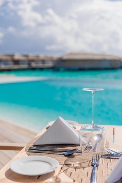 A szálloda éttermei és bárjai változatos gasztronómiai élményeket kínálnak. A főétterem, a Noo Faru, büfé jellegű ételeket és nemzetközi konyhát kínál. Három ? la carte étterem is rendelkezésre áll: a Ke-Un ázsiai konyhát, a Nonna olasz konyhát, és a Spa Corner különleges fogásokat kínál. Ezen kívül két bár és egy snack bár is található a szállodában, valamint egy borászat is elérhető.