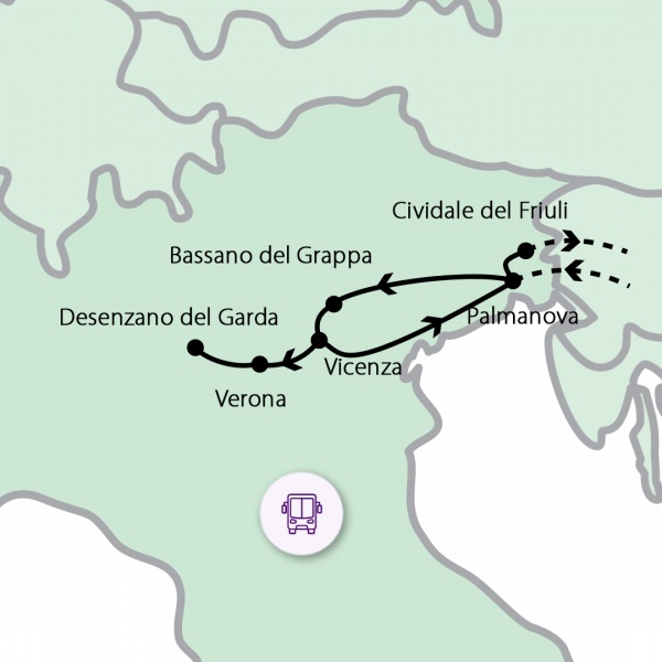 Ingyenes, reggeli transzferek indulnak Szegedről, Debrecenből, Miskolcról és Pécsről Budapestre. Mindhárom útvonalon további felszállási lehetőségeket biztosítunk. Budapest után Szlovénia érintésével, a csillag formájú olasz városba, Palmanovába utazunk. A város 9 bástyával, 18 sugárirányú utcával, egy szabályos, hatszögletű térrel és 3 óriási városkapuval a világ egyik legszabályosabb településeként van számontartva. Városnézés után tovább utazunk a grappa szülővárosába, Bassano del Grappába. A város jelképének számító Ponte degli Alpini, a fából és kőből épült híd. A központban található a Castello degli Ezzelini középkori vár. A város főtere a Piazza Garibaldi, akinek szobra a tér közepén áll. Meglátogatjuk a híres Poli grappa múzeumot, ahol lehetőségünk lesz a grappa gyártás rejtelmeivel megismerkedni, illetve megkóstolunk 5 fajtát az italból. Este Vicenza környéki szállásunkra megyünk. (2 éj)