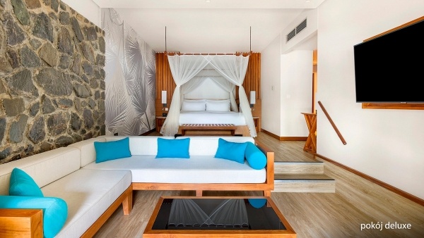 A deluxe szoba szintén két fő részére kínál elegáns és modern kényelmet, pótágy lehetőséggel gyermek számára. Mérete megegyezik a standard szobáéval, és felszereltsége is hasonló: egyénileg szabályozható légkondicionálás, zuhanyzóval felszerelt fürdőszoba, hajszárító, köntös és papucs, vezeték nélküli internet, műholdas televízió, kávé- és teakészlet, valamint széf. Ingyenes kiságy előzetes kérésre itt is biztosított. A deluxe szoba erkélyéről azonban gyönyörű kilátás nyílik a tengerre, ami különleges élményt nyújt. A minibár fogyasztása térítés ellenében vehető igénybe.