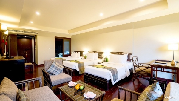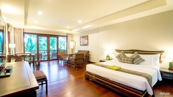 A Deluxe szoba kb. 55 m?-es, 2 fő részére, pótágy lehetőségével, egyénileg szabályozható légkondicionálással, fürdőszobával (kád vagy zuhany, WC, hajszárító, köntös), műholdas televízióval, telefonnal, Wi-Fi-vel, kávé- és teakészlettel, ásványvízzel és széffel. Erkély vagy terasz tartozik hozzá, kertre néző kilátással, minibár térítés ellenében.
