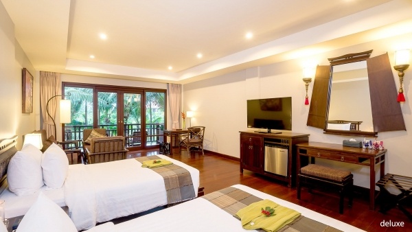 A Deluxe szoba kb. 55 m?-es, 2 fő részére, pótágy lehetőségével, egyénileg szabályozható légkondicionálással, fürdőszobával (kád vagy zuhany, WC, hajszárító, köntös), műholdas televízióval, telefonnal, Wi-Fi-vel, kávé- és teakészlettel, ásványvízzel és széffel. Erkély vagy terasz tartozik hozzá, kertre néző kilátással, minibár térítés ellenében.