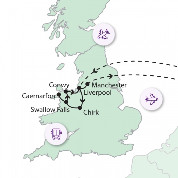 Reggel Snowdonia fővárosába, Betws-y Coed elbűvölő kisvárosába megyünk. A Snowdon Wales legmagasabb (1.085 m) hegye. Nehéz szavakat találni a tavas, dombos vidékre, jégvájta völgyekre, szép tengerpartra. Utunkat folytatva érjük el a Swallow Falls-t, Wales leglátványosabb vízesését, majd meghódítjuk a Snowdon hegycsúcsát, hegyi vasút segítségével. Ezután a tengerszoros partján fekvő festői városba, Caernarfon-ba látogatunk, ahol elsőként az ősi várat tekintjük meg, amely a Wales-i hercegek bölcsője volt. Megfelelő időjárási viszonyok esetén egy hajókázáson vehetünk részt, a Menai-szorosban. Szállás, vacsora, mint előző nap.
