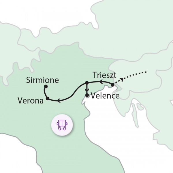 Ingyenes kora reggeli transzferek indulnak Szegedről, Debrecenből, Miskolcról és Pécsről Budapestre. Mindhárom útvonalon további felszállási lehetőségeket biztosítunk. A főváros után a tornyiszentmiklósi határra utazunk, majd haladunk tovább Szlovénián keresztül, miközben láthatjuk a Júlia- Alpok vonulatait. Olaszországba érkezve Trieszt városában állunk meg, mely már a Monarchiának is fontos kikötője volt. Belvárosában és a tengerparton sétálunk, ahol a bécsi mintára épített neoreneszánsz és eklektikus épületek kápráztatnak el bennünket. Ezek közül is kiemelkedik Olaszország legnagyobb, tenger felé nyitott terének látványa. Folytatjuk utunkat szállásunkra, ahol fakultatív vacsora (3 éj).