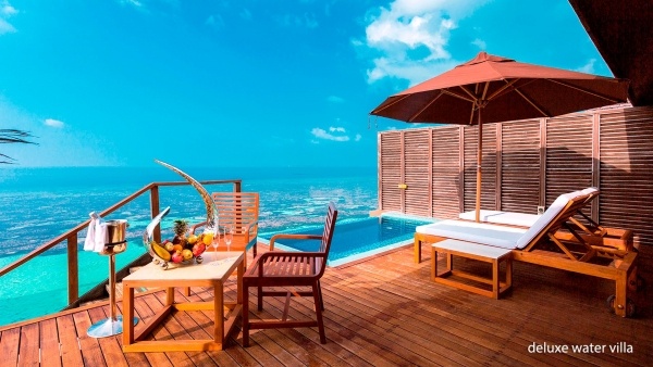 A deluxe vízi villák két fő részére készültek, egy pótágy lehetőségével felnőtteknek vagy két gyermeknek, és körülbelül 126 m?-esek. Felszereltségük megegyezik a tengerparti villákéval, de teraszuk pihenőhellyel, jacuzzival és közvetlen lejárattal a tengerhez rendelkezik. A deluxe vízi villákban 12 év alatti gyermekek csak a szülők teljes felelősségvállalási nyilatkozatának kitöltése után szállhatnak meg.