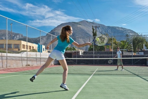 A hotel közvetlenül nem rendelkezik nagyméretű sportlétesítményekkel, azonban a Kamari strand mentén számos vízi sportolási lehetőség érhető el szezonálisan: jetski, parasailing, kajak és egyéb aktív programok foglalhatók helyi szolgáltatóktól. A környék túraútvonalai, kerékpárbérlési lehetőségek és a közeli kirándulóhelyek kiváló alkalmat nyújtanak a sziget felfedezésére. A napsütéses terasz és a medence környéke kényelmes pihenést biztosít azok számára, akik inkább nyugodt kikapcsolódást keresnek.