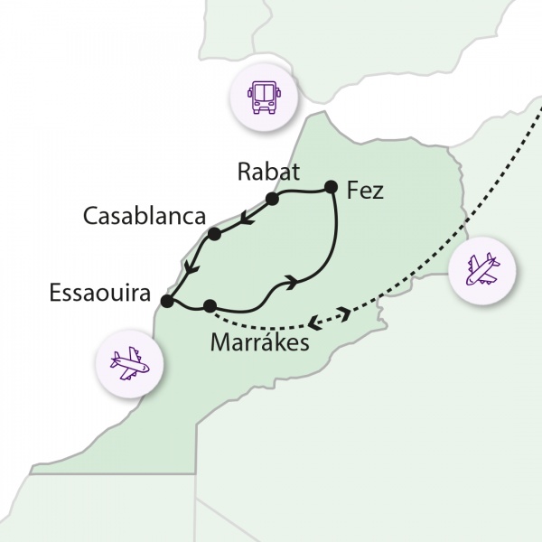 Reggeli után megnézzük a II. Hasszan Mecsetet, Casablanca meghatározó látványosságát, amely a világ hetedik és Marokkó legnagyobb mecsete. Ezután folytatjuk utunkat Essaouirába. A kikötő bejáratánál lévő bástyákról és az ezt övező falakról csodálatos kilátás nyílik a városra. A falakon belül Essaouira óvárosát árnyékos bevásárlóutcák, kávézók, valamint halat, gabonát, fűszereket, régiségeket és kézműves termékeket áruló bazárok alkotják. Meglátogatjuk a Bayt Dakirat, vagyis az Emlékezet Háza elnevezésű zsidó múzeumot, amelyet a helyi zsidóság tiszteletére emeltek. Transzfer a szállodába, vacsora.