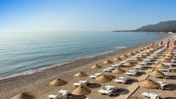 A szállodától mindössze körülbelül 150 méterre található a nyilvános strand, ahol a vendégek számára egy külön, a szállodához tartozó strandrész is rendelkezésre áll. A part homokos és kavicsos, lassan mélyülő, így ideális a családok és a nyugodt fürdőzést kedvelők számára. A vendégek kényelmét ingyenesen használható napernyők és napozóágyak szolgálják, míg a strandtörölközők letét ellenében vehetők igénybe. A parton strandbár is működik, ahol frissítő italok és könnyű harapnivalók várják a pihenni vágyókat.