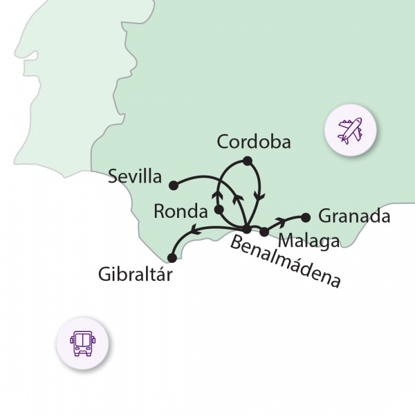 Menetrend függvényében, várhatóan a kora reggeli órákban a Liszt Ferenc Repülőtérről utazás Malagába. Megérkezésünk után séta a központban, mely során megtekintjük a több, mint fél milliós város fő látványosságait. A kikötőnél nagyon szép sétány fogad bennünket, látványos a katedrális, melyen a hosszantartó építése miatt több építészeti stílus is megjelenik. Tovább haladva a Plaza de la Merced térre érkezünk, ahol Picasso szülőháza is található, ezt követi a Larios főutca. Meg kell említeni a város másik ismert szülöttét, a híres színészt, Antonio Banderas-t is. Délután transzfer a Costa del Sol tengerparti szakaszán lévő szállodába (5 éj). A szobák elfoglalása után le lehet menni a tengerpartra. Hotelünk a parttól rövid sétára található. Vacsora.