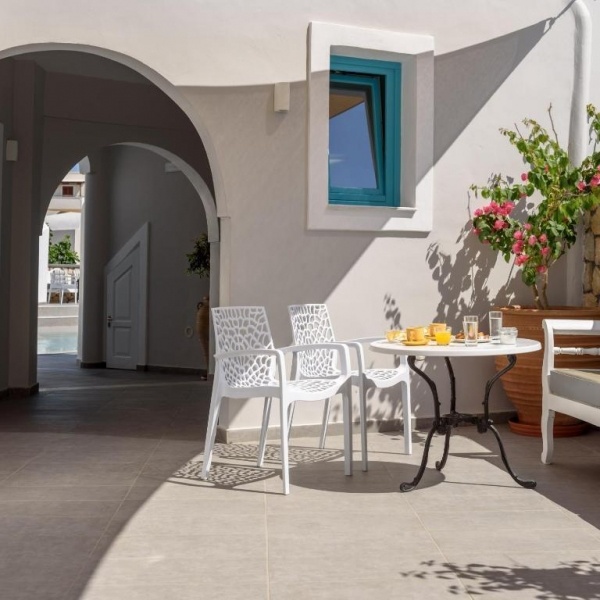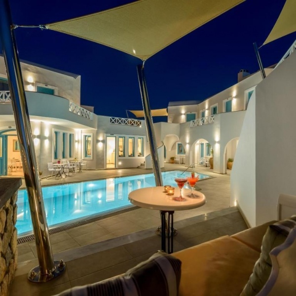 A hotel szőlőültetvényekkel körülvett, nyugodt helyen fekszik, 15 perc sétára Firától. A helyszínen buszok állnak rendelkezésre, amelyek a sziget különböző részeire viszik a kirándulni vágyókat. A legközelebbi tengerpart 2,3 kilométerre, a repülőtér kb. 5 kilométerre van. A közelben találhatóak kávézók és bárok.