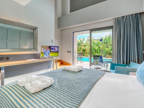 SZOBÁK: 335 szoba o erkély vagy terasz o egyedi légkondicionálás o hajszárító o műholdas TV o telefono minibár (érkezéskor üdítőkkel feltöltve, naponta vízzel utántöltve) o vízforraló o tea- és kávéfőző szett o széf o wifi o Superior szobák: kb. 28-30 m?, max. 2 fő részére o Családi szobák: kb. 40-45 m?, max. 4 fő részére, 2 hálószobával o Standard szobák: kb. 28-30 m?, max. 2+2 vagy 3+1 fő részére, tájra, tengerre vagy oldalirányú tengerre néző kilátással oSwim up (családi) duplex szobák: kb. 45-52 m?, max. 4 fő részére, napozóterasszal, közvetlen medencekapcsolattal