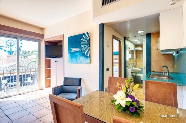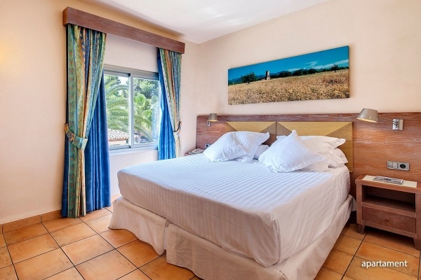 Apartman: (lehetőség 1 pótágyra egy felnőtt vagy 2 gyermek számára), kb. 35 m?, bungallókban, gondozott, ízlésesen berendezett, egyénileg szabályozható légkondicionálóval, hálószoba és egy nappalival, ajtóval elválasztva, fürdőszoba (kád zuhanyzóval, WC; hajszárító), WiFi, LCD műholdas TV, telefon, teljesen felszerelt konyhasarok, hűtőszekrény; térítés ellenében: széf (14 EUR/hét; 5 EUR/letét), erkély vagy terasz (2 szék)