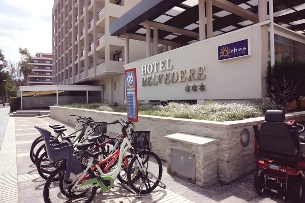 A közelben elterülő, hosszú és széles, homokos közösségi strand enyhén lejt a tenger felé, így ideális a fürdőzéshez és a napozáshoz. A part tömegközlekedéssel vagy kényelmesen járdán keresztül is megközelíthető, a napernyők és napozóágyak pedig felár ellenében vehetők igénybe.
