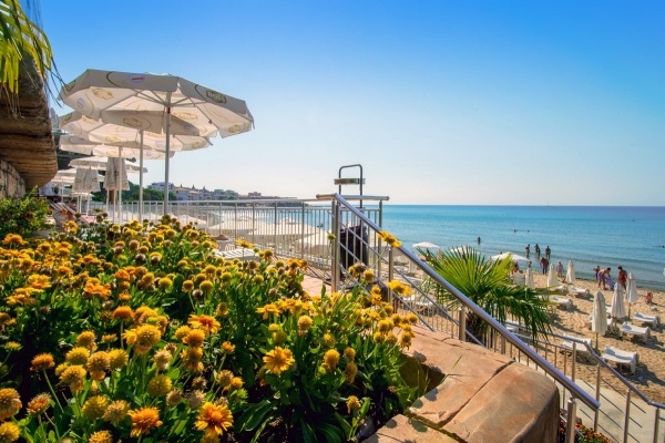 A strand hosszú, homokos, aprókavicsos parttal rendelkezik, amely lassan mélyülő. A strandhoz panorámás lift és lépcső is biztosított. Napernyők és napozóágyak bérelhetők, kb. 30 BGN/napernyő és 2 napozóágy/nap áron. Törölközők letét ellenében vehetők igénybe.