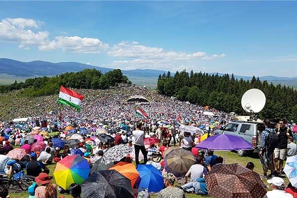május 23: Csíksomlyó (részvétel a hálaadó körmenetben. A kálvárián keresztül felkapaszkodunk a Jelenések-hegyére. A szabadtéri szentmise után érdemes felkeresni a csodatévő Szűz-Mária szobrot a kegytemplomban) - Csíkszereda (szabadidő) - Hargita-hegység - szállás Tusnádfürdőn.