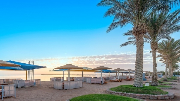 A szállodához tartozó, mintegy 300 méter hosszú homokos-kavicsos strand kellemes és kényelmes környezetet biztosít a pihenéshez. A part mentén sekély víz található korallos tengerfenékkel, ezért a biztonságos fürdőzés érdekében ajánlott védőcipőt viselni. A mélyebb víz könnyebben megközelíthető a körülbelül 630 méter hosszú mólón keresztül, amely a szálloda területéről kényelmesen elérhető. A strand teljes területén ingyenesen használhatók a napernyők, napozóágyak, matracok és törölközők, valamint egy bár is várja a vendégeket, frissítő italokkal és könnyű harapnivalókkal.