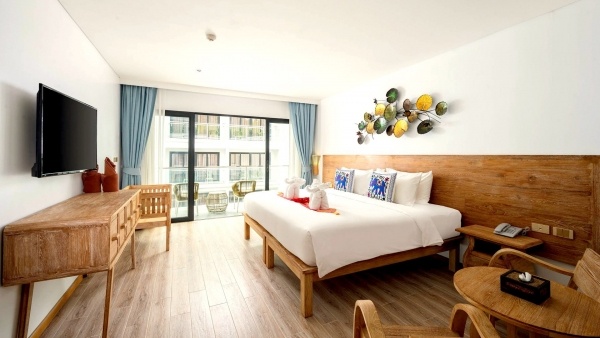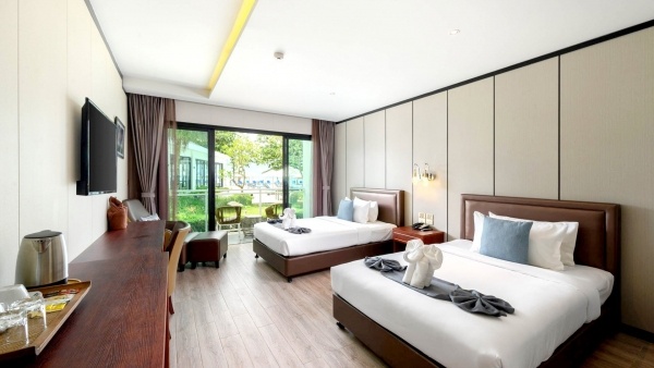 A kertre néző Deluxe szoba két fő számára kínál kényelmes elhelyezést pótágy lehetőségével, körülbelül 35 m? alapterületen. Légkondicionált, fürdőszobája zuhanyzóval, WC-vel és hajszárítóval felszerelt. A szobában vezeték nélküli internet, műholdas televízió, telefon, kávé- és teakészlet, valamint minibár áll rendelkezésre, amely naponta két palack vizet biztosít ingyenesen. Az erkélyen asztal és székek találhatók, kilátással a kertre.