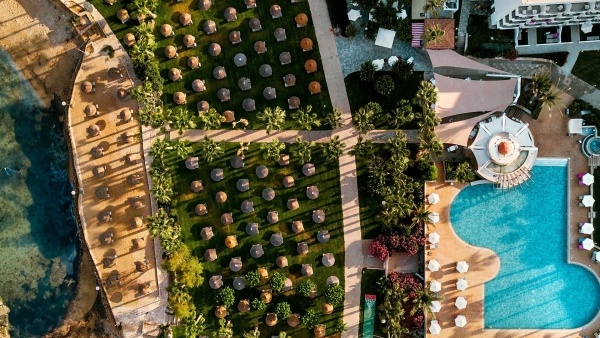 A szálloda közvetlen közelében található nyilvános, homokos-kavicsos strand enyhén lejt a tenger felé, ezért kényelmesen megközelíthető és ideális a fürdőzéshez. A part megközelítése a szálloda területén keresztül lehetséges, védőcipő viselése ajánlott. A vendégek számára napernyők, napozóágyak és matracok térítésmentesen állnak rendelkezésre, előzetes foglalás mellett, a strandtörölközők letét ellenében igényelhetők. Emellett a közelben egy másik, Kék Zászló minősítéssel rendelkező, homokos strand is található, ahol a napernyők és napozóágyak díj ellenében vehetők igénybe.