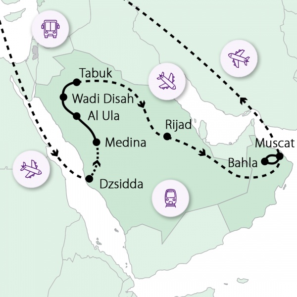 Ez az út átfogó képet ad az Arab-félsziget sokszínűségéről: szent városokról, sivatagi völgyekről, oázisokról és ma is élő hagyományokról.