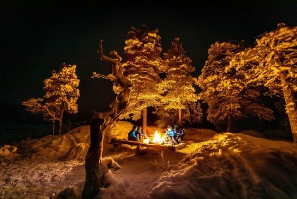 Vacsora után hómobilok vontatta szánokra szállunk, hogy a várostól távolabb eső, fényszennyezettségtől mentes táborhelyünkre induljunk.Már az út ragyogó lehetőséget kínál a esti égbolt megcsodálására! A tábortűz mellett, miközben mi meleg italunkat kortyolgatjuk, idegenvezetőnk mesél az északi fény kialakulásáról, az azt körülvevő helyi mítoszról, hiedelmekről. Megfelelő időjárási viszonyok esetén megcsodálhatjuk a téli égbolton táncoló zöld fényeket. Életreszóló élmény! Ha az északi fényt - természeti jelenség lévén - garantálni nem is tudjuk, ez a program kiválóan alkalmas azoknak, akik természetközelben szeretnék élvezni a csodás sarki éjszakát.