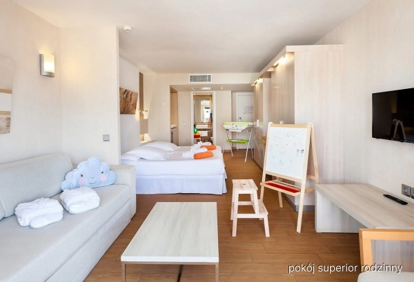 SZOBA: standardowy: 2 személyes, kb. 20 m?, légkondicionált, fürdőszoba (zuhanyzó, wc; hajszárító), vezeték nélküli Internet, műholdas TV, telefon; felár: széf; erkély vagy terasz (asztal és székek), kilátás a környékre; tengerre néző kilátás felár ellenében; superior: 2 fős (1 pótágy egy felnőtt vagy 2 gyerek részére - kihúzható kanapé), kb. 33 m?, berendezése mint egy standard szobában, ezen kívül: konyhasarok (kis hűtő, mosogató, mikrohullámú sütő, fűtőlap, kávé/tea főző készlet); erkély vagy terasz (asztal és székek), kilátás a környékre; tengerre néző kilátás felár ellenében; családi felsőbbrendű: 2 fő (1 pótágy egy felnőtt vagy 2 gyerek részére - kihúzható kanapé) kb. 33 m?, standard szoba berendezéssel, ezen kívül: fürdőköpeny, papucs, PlayStation, gyerekjátékok, gyerekülés, kávéfőző, hűtőszekrény; erkély vagy terasz (asztal, székek), kilátás a környékre; Superior és superior családi szobák felár ellenében.