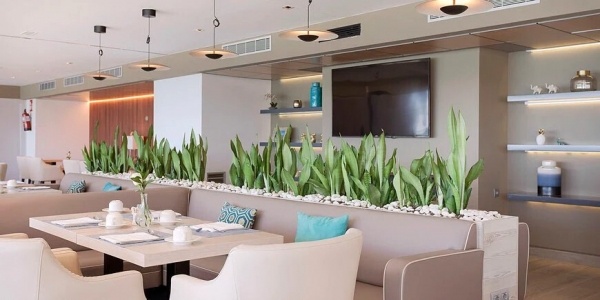 A szállodában egy étterem működik, ahol svédasztalos reggeli, valamint ebéd és vacsora ? la carte formában érhető el. Az étterem mediterrán konyhát kínál, és vegetáriánus, valamint gluténmentes étrend is elérhető. A gyermekek számára gyerekülések biztosítottak. A szállodában három bár található: a lobbyban, a medencénél (snackekkel), valamint a The Level részlegen, amely kizárólag a The Level vendégei számára hozzáférhető. Teljes ellátás igényelhető felár ellenében, a reggeli 7:30-10:30 között svédasztalos, az ebéd 13:30-15:45 között, a vacsora pedig 20:30-22:30 között ? la carte formában fogyasztható az étteremben. Az italok ebédhez és vacsorához külön fizetendők.